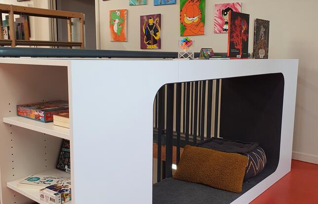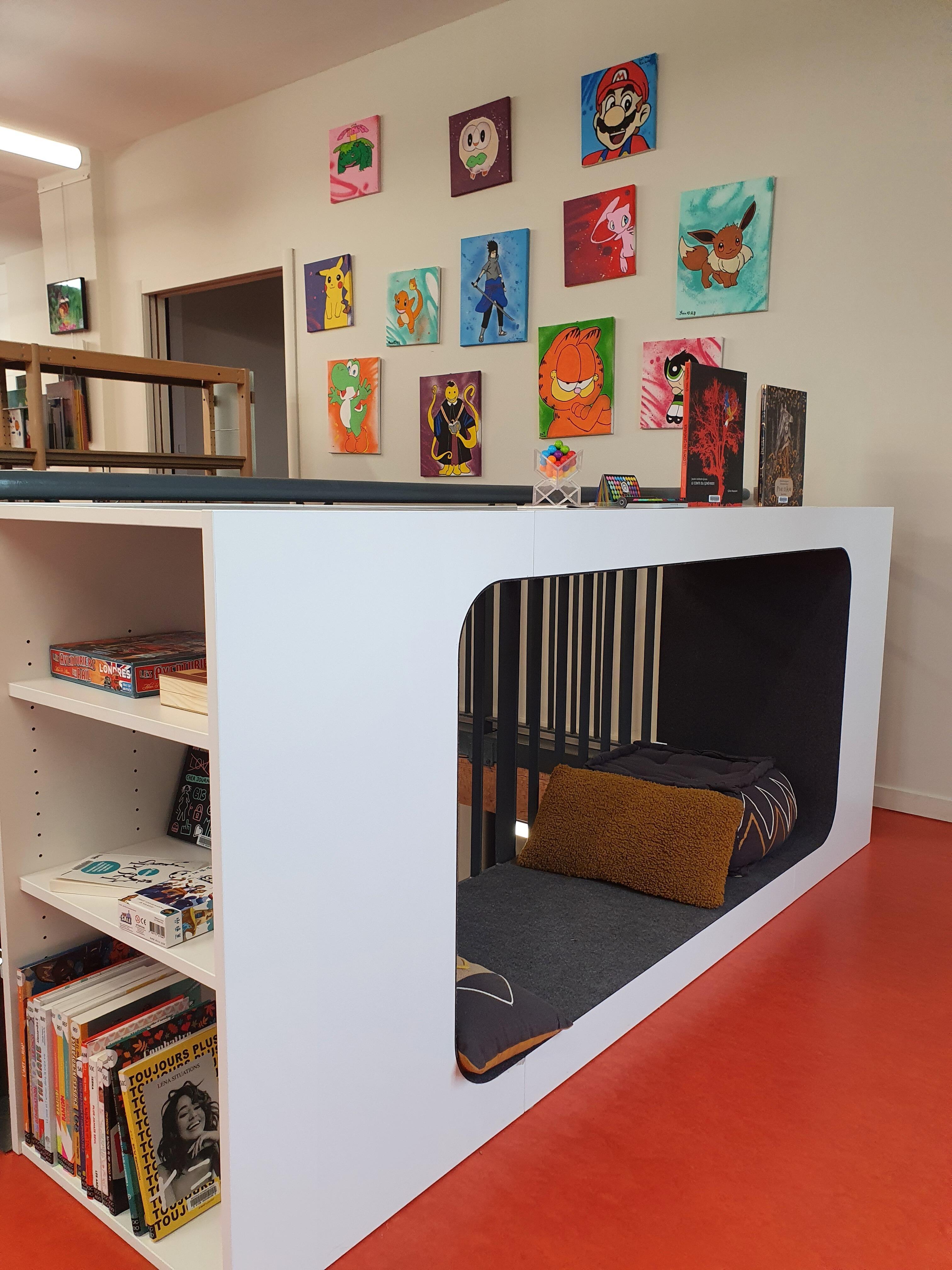 Le résultat final se trouve à l'étage, à l'écart de l'accueil, avec une cabane-niche douillette particulièrement appréciée. Les jeunes ont finalisé la décoration au cours d'un chantier Ville-Vie-Vacances subventionné par la CAF et encadré par un grapheur. Leur œuvre : des toiles sur le thème de la BD et du manga. « Les participants aiment les voir et commenter, ainsi que les petits frères/petites sœurs et autres enfants plus jeunes. » Pour inaugurer les lieux : un escape game.