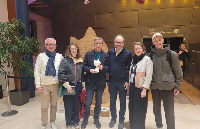 L’équipe de Steinkis autour du fauve d’or jeunesse à Angoulême : Benoit Frappat, Anne-Charlotte Velge, Laurent Galandon, Moïse Kissous, Estelle Dumesnil et Guillaume Kapp - Photo DR