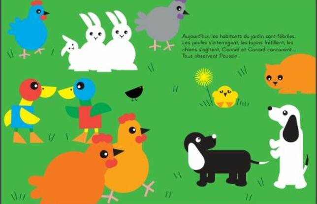 Champoulement. Aujourd'hui, toute la basse-cour est en émoi. Poussin n'est pas comme d'habitude. Il reste prostré dans son coin, ne joue pas, ne rit pas. Devant l'attitude étrange du plus petit habitant de l'enclos, chacun y va de son interprétation. Les poules roucoulent, les oies ondoient, les lapins racontent plein de potins, et Canard et Canard cancanent. Tu as vu, il n'a pas bougé depuis ce matin ? Mais que lui arrive-t-il ? Seule Grise, la poule sage, garde les plumes sur les épaules et va voir Poussin. Après lui avoir demandé si c'est pour demain, elle lui chuchote un mot à l'oreille et lui demande de la suivre au fond du jardin. Elle a sa petite idée, on peut lui faire confiance. Elle glisse des fleurs dans le cartable de Poussin. Un cartable ! Mais c'est quoi ? C'est pour aller travailler ? C'est pour devenir papa ou maman ou quoi ? Lapereaux, chiots et bébés dindons s'interrogent. Puis tous comprennent que le grand jour est celui de la rentrée, qui terrorise Poussin autant qu'il l'enchante. Avec ses illustrations simples et naïves aux couleurs primaires, Claire Garralon évoque avec talent les inquiétudes liées aux premières fois. On craque pour la bouille de ses petits animaux qui font des gorges chaudes et des hypothèses farfelues sur le changement d'humeur de Poussin. À la fin, le grand cortège de tous les amis venus accompagner le futur écolier ravit les mirettes. Aux hôtes de la basse-cour se joignent le cerf, la biche, le faon, les hérissons... Pour affronter le grand jour, pas question d'être seul !