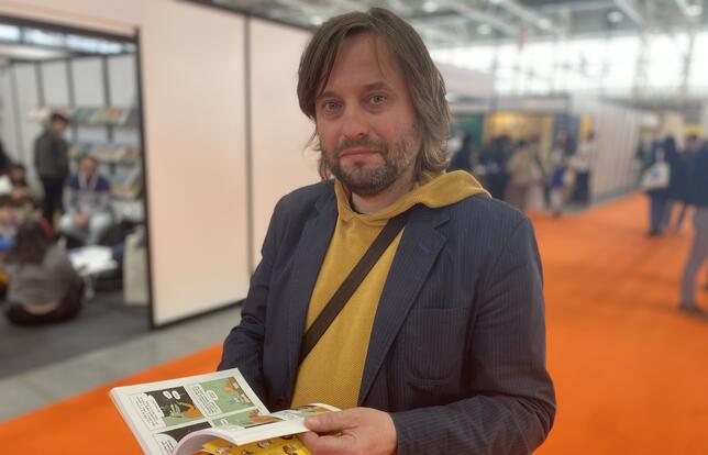 Il a le sourire chaleureux et le regard vif et profond. Pourtant, Dmitri Iakovlev vit un véritable calvaire depuis six mois, loin de sa famille. Cet éditeur de BD de 41 ans, qui publie notamment en russe le succès français Ariole d’Emmanuel Guibert et Marc Boutavant, a rejoints ses auteurs français à Bologne depuis Marseille, où il est actuellement hébergé. « Je ne suis ni là vraiment pour le travail, ni pour les vacances », pose-t-il d’un ton calme, comme si errer lui était devenu naturel. C’est en tout cas ce qu'il fait depuis septembre : d’abord en Finlande, puis en Turquie avant d’atterrir en France grâce au soutien de l’Institut français de Moscou.