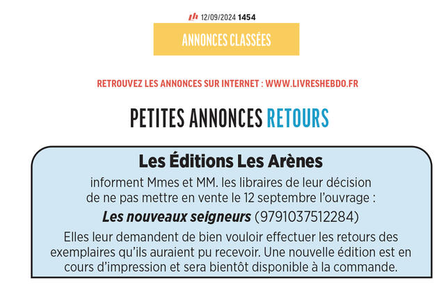 Or, il est apparu que dès le 2 septembre 2024, après avoir reçu le courriel de Jours de passion, la société Les Arènes avait publié une annonce dans Livres Hebdo demandant aux libraires de ne pas mettre en vente l'ouvrage litigieux et d'effectuer les retours des exemplaires reçus. Les Arènes ont également justifié avoir adressé un message aux libraires via leur distributeur, Interforum, pour réitérer l'interdiction de commercialisation.