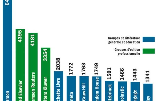 éditoriales ne sont pas sans effet sur le Top 12 des plus grands des grands groupes mondiaux. Certes, Pearson demeure, de très loin, le leader de l'édition mondiale. Il renforce même encore sa position devant Reed Elsevier, Thomson Reuters et Wolters Kluwer. Mais Bertelsmann, qui fut dans les années 1980-1990 le leader mondial de l'édition, est désormais réduit à sa branche d'édition généraliste (n° 8) après la dislocation de sa division clubs. Hachette Livre (n° 5) gagne ainsi une place malgré un chiffre d'affaires en léger tassement l'an dernier. L'espagnol Planeta (n° 6), propriétaire du français Editis, en gagne même deux en coiffant sur le poteau McGraw-Hill Education (n° 7), avec lequel il est au coude-à-coude depuis l'an dernier. Dans la foulée, Holtzbrinck (n° 9), Scholastic (n° 10) et Wiley (n° 12) affichent un beau dynamisme, repoussant Cengage du 9e au 11e rang et reléguant l'italien De Agostini à la 13e place. Symptomatiquement, trois des tout premiers groupes d'édition mondiaux sont concentrés sur l'édition professionnelle (Reed Elsevier, Thomson Reuters, Wolters Kluwer), et quatre sont des leaders mondiaux sur les divers segments de l'édition d'éducation et de formation (Pearson, même s'il détient aussi le groupe d'édition généraliste Penguin, McGraw-Hill Education, Cengage et Wiley). Et la plupart des autres développent, à côté de leur activité dans l'édition généraliste, une activité scolaire (Hachette, Planeta, Holtzbrinck) ou parascolaire (Scholastic). Une garantie pour un avenir qui demeure incertain.