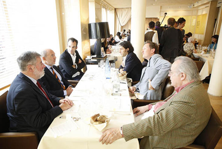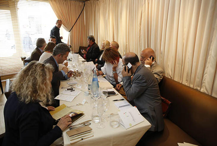 La table de Tahar Ben Jelloun et de Philippe Claudel, en compagnie de journalistes occupés à communiquer la première sélection par téléphone. - Olivier Dion