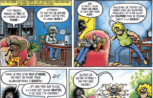 Vendus dans des head shops, magasins alternatifs où l’on pouvait aussi se procurer toutes sortes de substances, les comix abordaient ainsi largement la sexualité et la drogue dans leurs pages. Les Freak Brothers n’échappent pas à la règle : la BD de Gilbert Shelton et Paul Mavrides narre les aventures de Phineas, Freewheelin’ Franklin et Fat Freddy, trois pieds nickelés décidés à aller chercher de la drogue directement dans les pays producteurs et qui ne parviennent qu’à offenser des groupes terroristes, des trafiquants d’êtres humains, des pirates et des fanatiques religieux.
