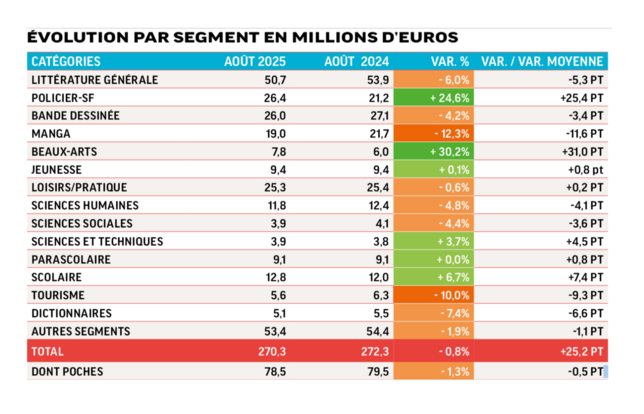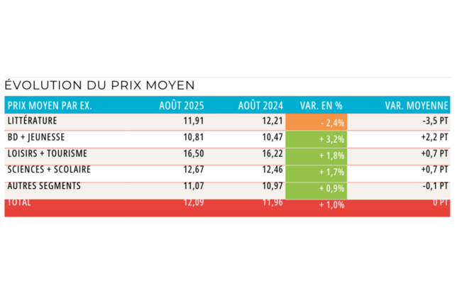 Le mois d’août est en repli en valeur (-0,8 %) comme en volume (-1,8 %) par rapport au mois équivalent de l’année précédente. La hausse cumulée du policier-SF-fantasy, des beaux-arts et des sciences et techniques (+ 9,8 millions d’euros) ne suffit pas à pallier les baisses des rayons BD, manga, jeunesse (-5,30 M€) et de la littérature générale (-3,50 M€). Par ailleurs, l’impact prix sur le marché provoque une hausse de 0,8 million d’euros, reflété paradoxalement par une hausse du prix moyen plus forte de l’ordre de 1 %. Ce qui s’explique par la baisse du prix moyen constaté sur des segments en croissance en volume.
