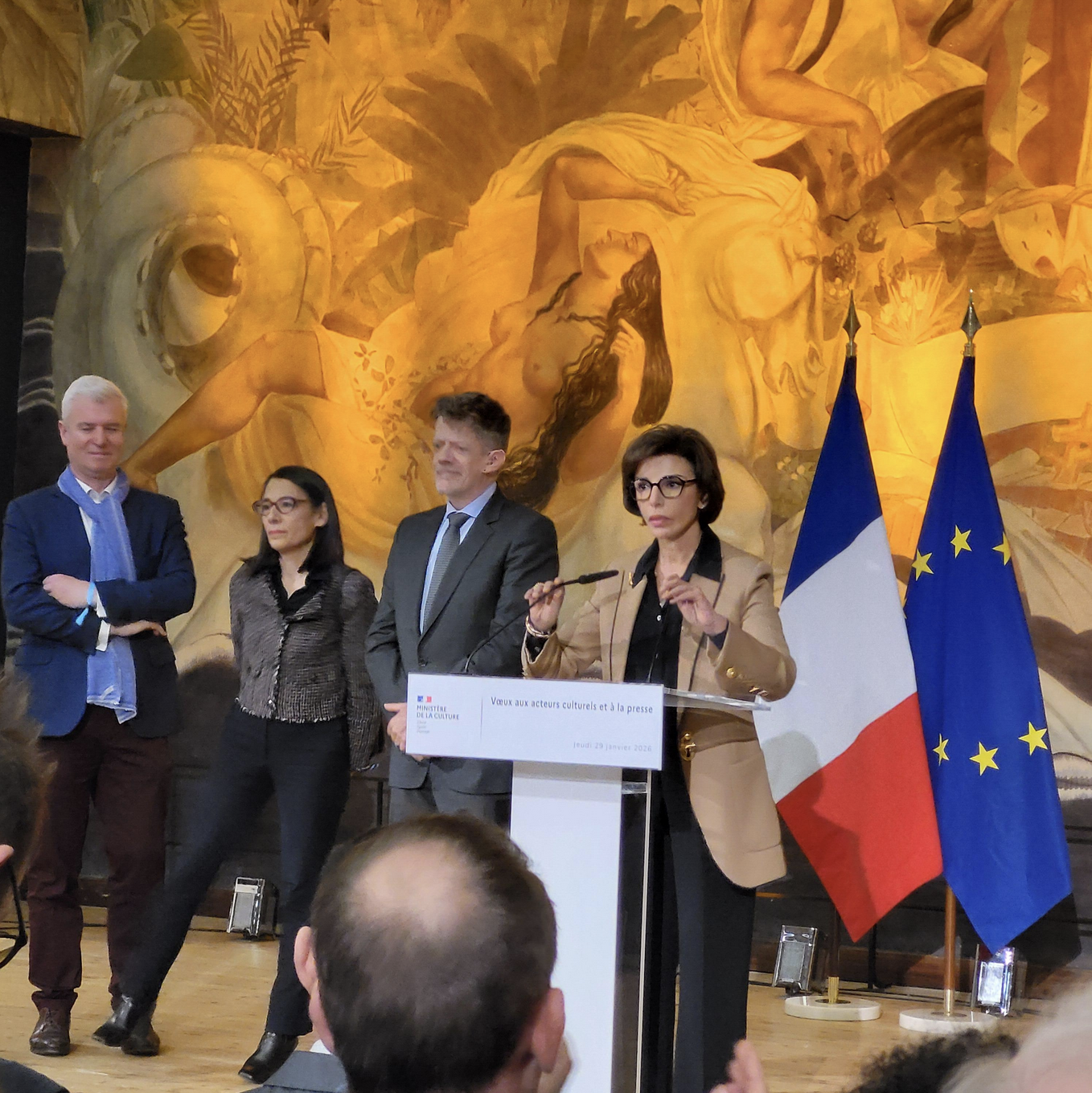 Alors que Rachida Dati est candidate à la mairie de Paris dont le scrutin a lieu au mois de mars, la ministre a clôturé son discours par une phrase sibylline assurant de son soutien constant : « L’idée que je me fais de la Culture dépasse ce ministère : c’est le combat d’une vie ».