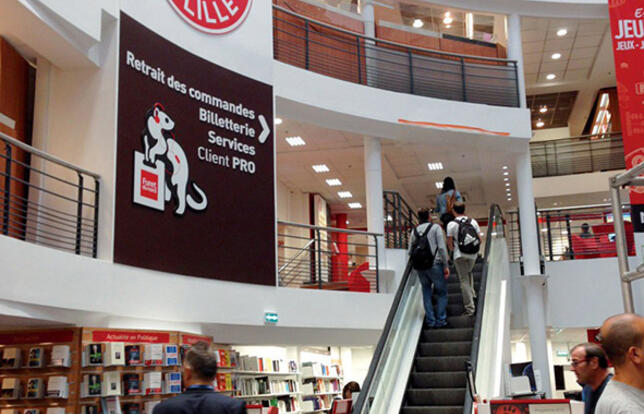 Le Furet du nord offre à son magasin lillois un logo personnalisé pour accompagner sa récente refonte. "Nous voulons redonner à notre vaisseau amiral son leadership au sein du réseau, argumente Pierre Coursières, P-DG de l’enseigne qui compte 16 points de vente. Sa précédente rénovation remonte à 2004. Or depuis dix ans, notre concept et nos marchés ont évolué. Il n’était pas logique que notre magasin phare soit l’un des moins représentatifs." D’importants travaux ont donc permis de moderniser l’établissement de 4 700 m2 répartis sur neuf étages. L’accent a été mis sur la clarté, avec l’installation de nouveaux luminaires et l’ouverture de plusieurs vitrines au rez-de-chaussée, sur la lisibilité de l’organisation du magasin et sur sa convivialité, avec, à chaque étage, des espaces de pause proposant quelques sièges, des prises de recharge de portable et le Wi-Fi gratuit. D’ailleurs, l’élément fort du réaménagement est la revendication de la dimension connectée du magasin autour du slogan "Le Furet partout, tout le temps". Certains rayons livres accueillent des écrans de démonstration et des bornes d’ebooks. Et le département musique propose un bar à musique alimenté par Deezer. Parallèlement à ces innovations, le point de vente a aussi amélioré son mix-produit. "Entre la baisse du multimédia et l’introduction des loisirs créatifs et des jouets, le livre n’a rien perdu en mètre linéaire, assure Pierre Coursières. Par contre, il y a eu une redistribution au profit de la grande diffusion, jeunesse et tourisme en tête, au détriment du scolaire et de l’universitaire." Evoquant un investissement entre 2 et 5 millions d’euros, le dirigeant estime avoir remis sur les rails de la croissance le Furet de Lille qui affichait l’an dernier un CA stable à 30 millions (dont 19 millions avec le livre), soit 35 % des 86 millions de l’enseigne. Clarisse Normand
