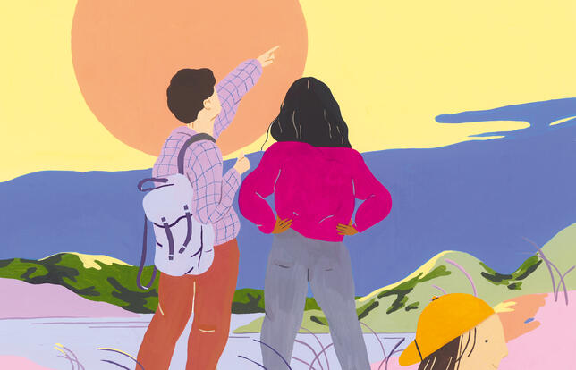 C'est encore loin ? Le temps de fourrer les pyjamas et le doudou dans la valise et hop, en voiture Simone ! Cap sur les vacances. Mais à peine le petit Marin a-t-il bouclé la ceinture de sécurité dans son siège auto que déjà il demande si on est bientôt arrivé... Pour le faire patienter, Maman et Côme répondent : « quand les gratte-ciel seront aussi petits que des fourmis. » Bof ! Marin n'est pas franchement convaincu par cette histoire à dormir debout et continue de trouver le temps long. Si seulement il se passait quelque chose pour rompre la monotonie de cette fichue autoroute ! Tiens, pourquoi pas une grande tempête qui mettrait un peu d'ambiance ? Un peu plus tard, l'originalité du jeu proposé ne parvient pas davantage à exciter le petit garçon : s'il voit un pissenlit, c'est trois points, une marmotte, dix points, un edelweiss, mille points. Marin a beau écarquiller les yeux pour débusquer les précieux butins, il ne trouve rien. Rien de rien. À la pause pipi, l'ennui connaît un petit répit quand il fait le clown à travers la vitre avec la fille de l'auto d'à côté. Lorsque la route se met à serpenter à travers les montagnes, on lui assure que cette fois la destination est toute proche mais, bercé par le ronron du moteur, Marin s'est quasi endormi. En tout cas, la voiture familiale a quitté la route et s'est envolée entre les oies sauvages et les nuages... Cet album rêveur étire ses pages aux couleurs joyeuses entre ennui du trajet et enchantement du paysage. Quels trésors d'inventivité il faut déployer pour vaincre la monotonie du macadam !