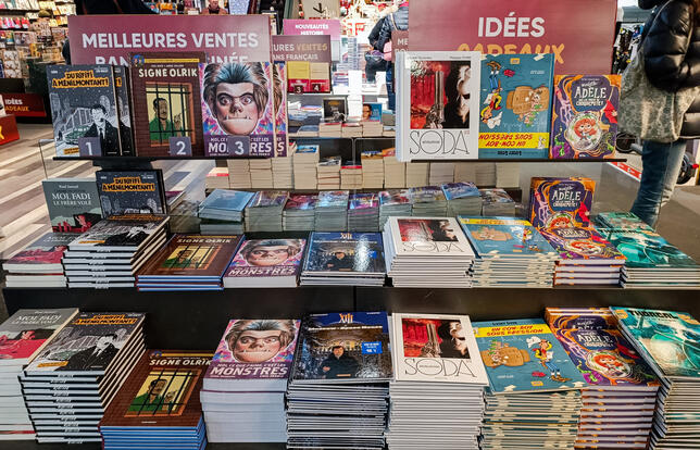 Et si c’était à nouveau une BD, la meilleure vente de l’année ? Le dernier album de Lucky Luke signé Jul qui truste le classement hebdomadaire depuis plusieurs semaines (Lucky Comics) et pointe à 140 000 ventes, ne semble pas en mesure de s’imposer, pas plus que le nouveau Blake et Mortimer d’Yves Sente et du regretté André Juillard qui approche des 160 000 exemplaires ou le dernier Mortelle Adèle de Mr Tan et Diane Le Feyer (Mr Tan & Co) qui flirte lui aussi avec la barre des 160 000 ventes. Cette année sans nouvel Astérix offre donc plus d’incertitude quant à la pole des ventes, qui étaient dominées les deux années précédentes par des BD : L’Iris blanc de Fabcaro et Didier Conrad en 2023 et Le monde sans fin de Jean-Marc Jancovici et Christophe Blain en 2022.